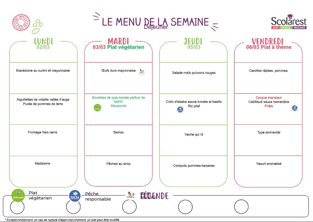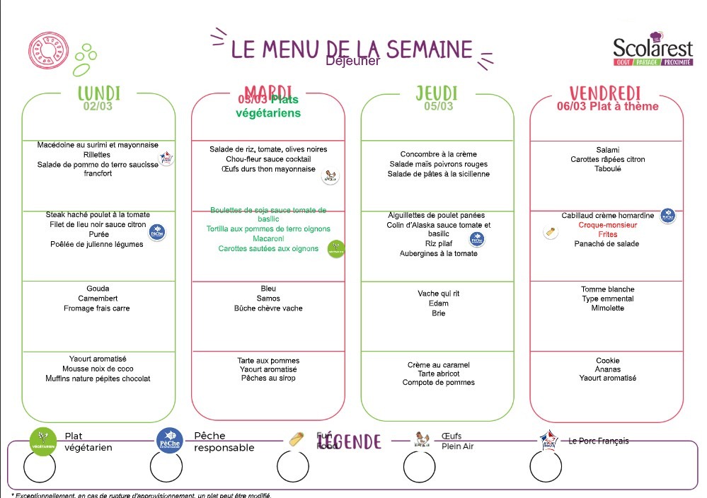 Nos menus pour la période du lundi 02 mars au 07 mars